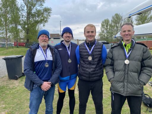 The conditions on the Saturday were much to be desired, with strong winds and big waves in the middle of the lake making for very difficult rowing conditions throughout the day. Catherine was entered in both a composite masters four and a double alongside members from Berwick Rowing club, battling against the weather and waves to finish a sterling 2nd in both events. Stuart surfed the waves in a single and also finished second. To keep the silver theme, the masters mens quad of Simon, David, Andrew and Stuart also finished second (image with silver medals!).