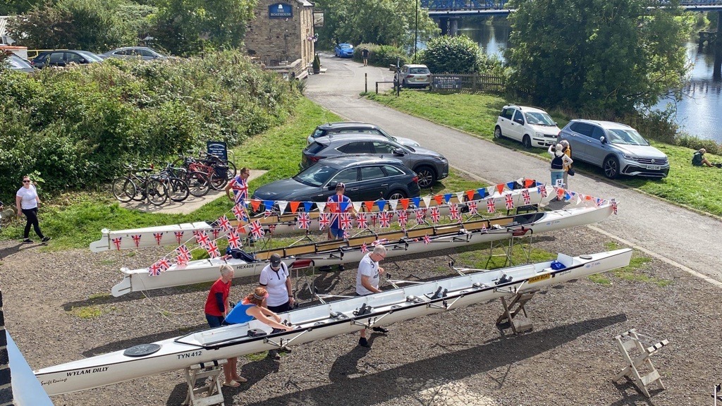 Heavy showers were predicted on the day over Hexham and Newburn, but the best weather was forecast on the coast in North Tyneside. Two Hexham crews HEXpedition and HEXplorer were among 20 crews from far and wide taking part. With all crews having varied experience, strength and composition and rowing in stable boats. The theme for the day was “The Coronation ” so boats in most cases were decked in flags, red, white and blue and regal costumes worn by rowers.